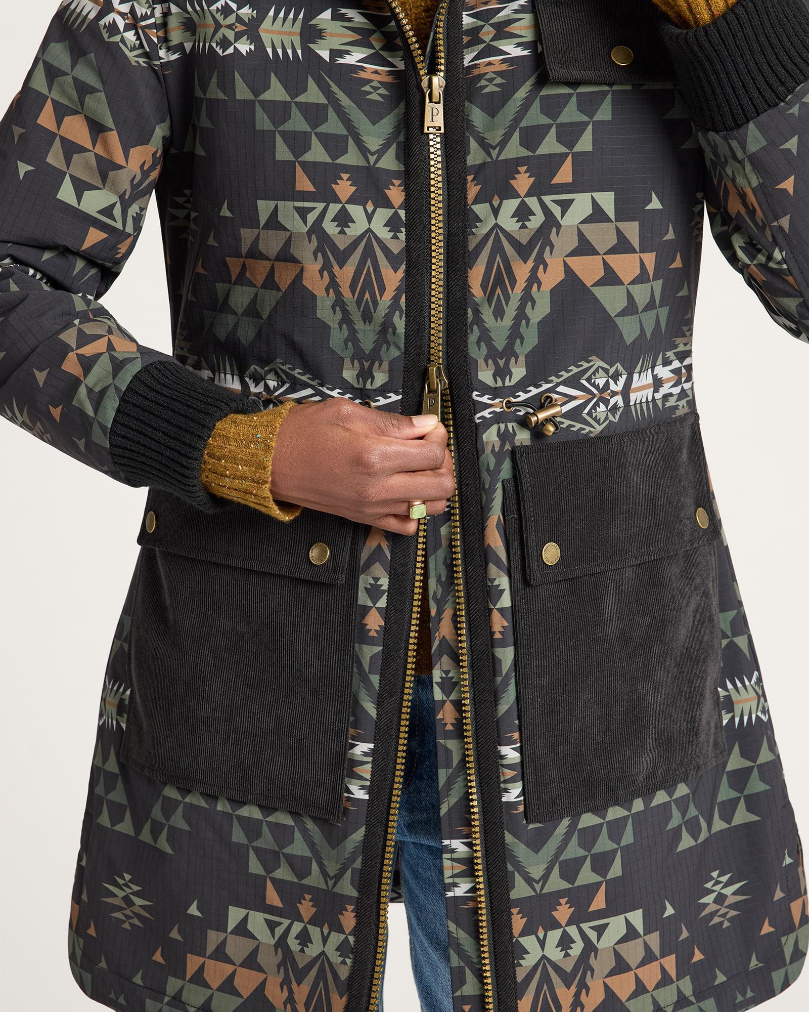 The Pendleton Powder River Anorak is a longer two-tone anorak with corduroy details, a two-way zip front, and a layback hood crafted in patterned Ripstop. 34 inches long. Corduroy trim on center front, chest pocket flap, lower patch pockets. Layback hood, chunky knit cuffs, adjustable drawcord waist. Flattering shirttail hem with gusseted side vents. Imported of 74 percent polyester / 26percent ELASTERELL-P W SORONA®. Machine washable.