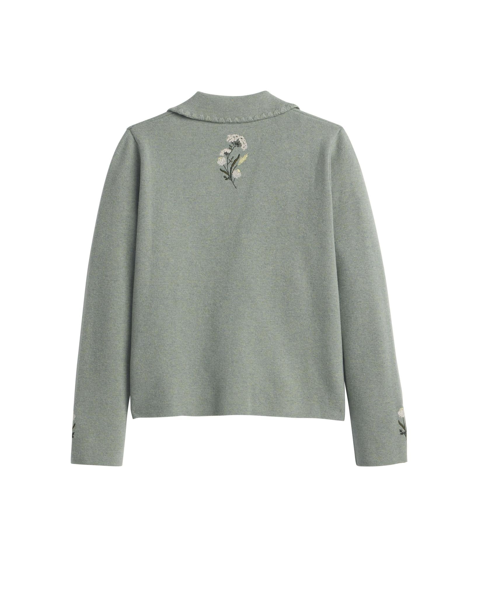 22.5 inches long. Bestselling button-front cardigan with knit collar. Floral embroidery. Two patch pockets. Nickel silver novelty buttons. Whipstitch accents. 70% COTTON / 30% MERINO WOOL - EXCLUSIVE OF DECORATION. Dry clean only.