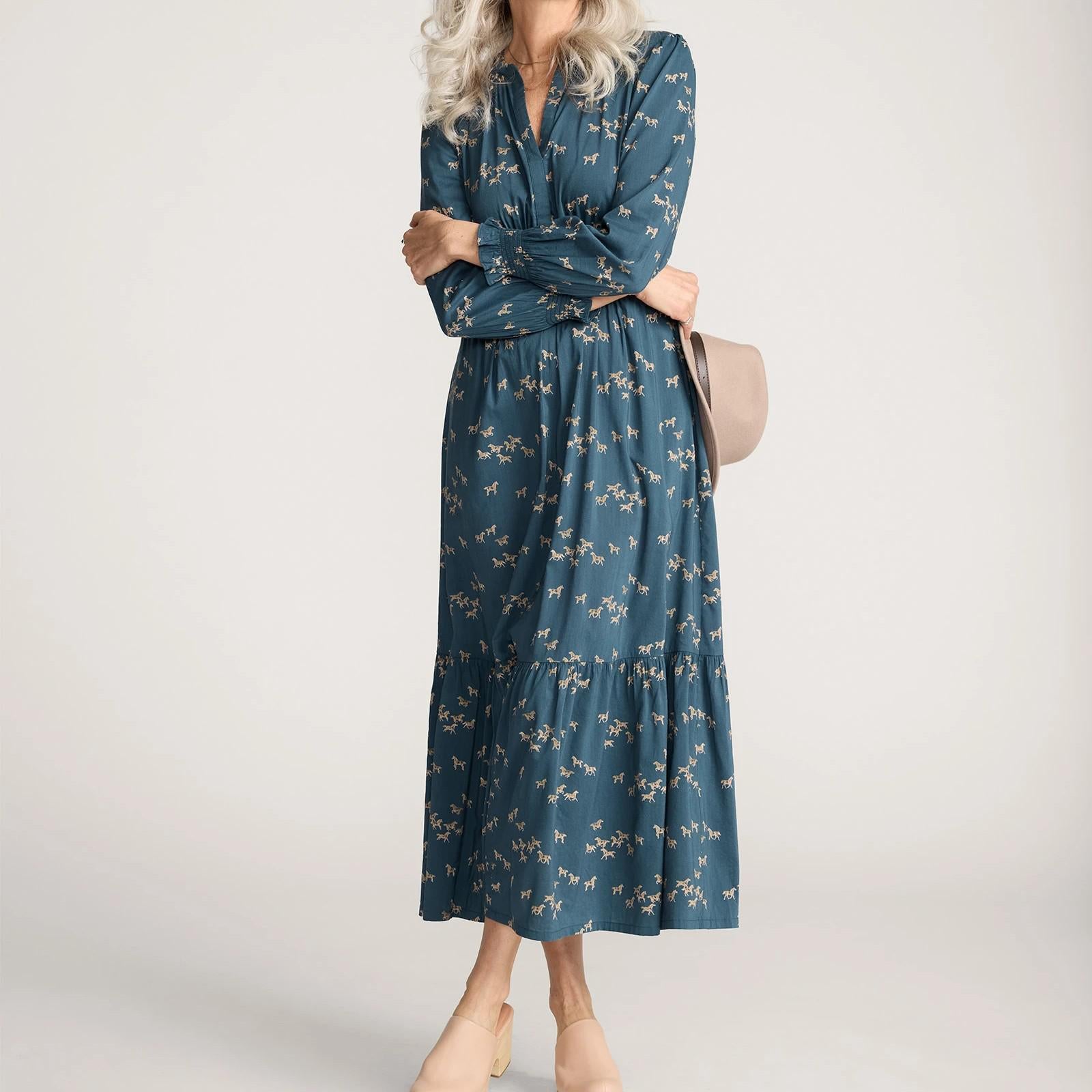 A flowy midi dress with feminine details in a new equestrian print exclusive to Pendleton. 53 inches long. Flowing length in a soft fabric with an open placket, gathers at waist. Gathered smocking detail at wrist of long full sleeves, tiered full skirt with side seam pockets. Imported of 53 percent cotton, 47 percent viscose. Hand wash.