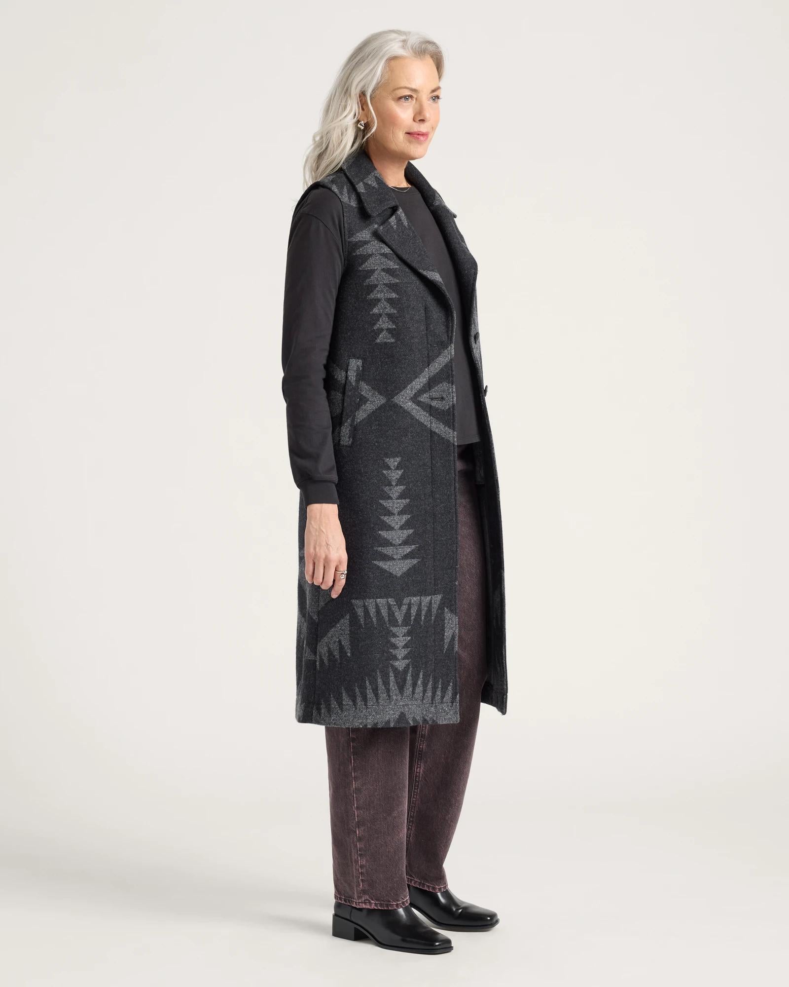 Layer up this new sleeveless Pendleton style, with trench coat features and crafted in USA woven wool. 44 inches long. Notched lapel, button front. Uses a beautiful asymmetrical placement of an exclusive Pendleton jacquard pattern. Generous length to layer over jeans and dresses. Imported of 100 percent virgin wool, woven in Pendleton's USA mills. Dry clean only.